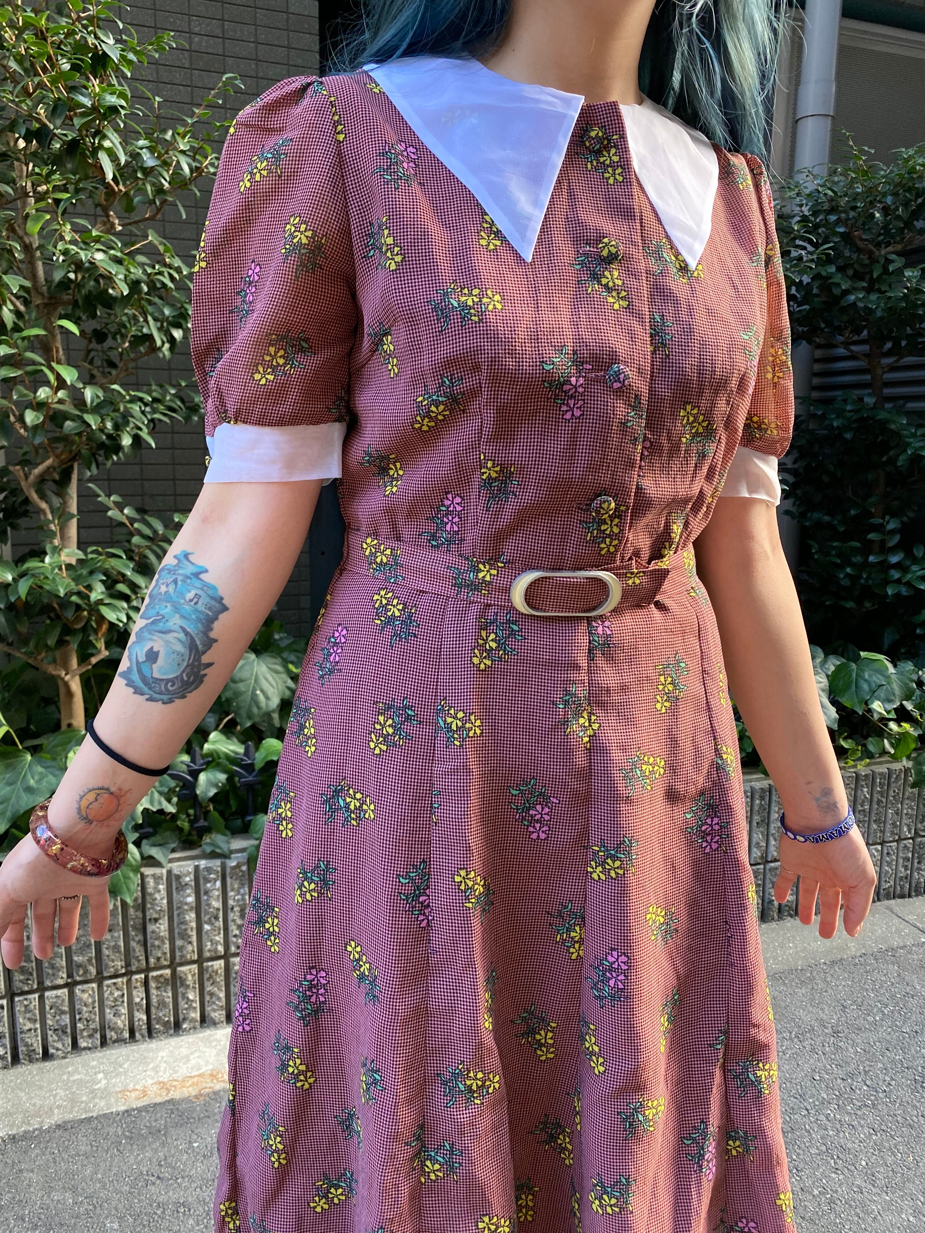 ピンクとブラックのギンガムチェックと花柄ワンピース*